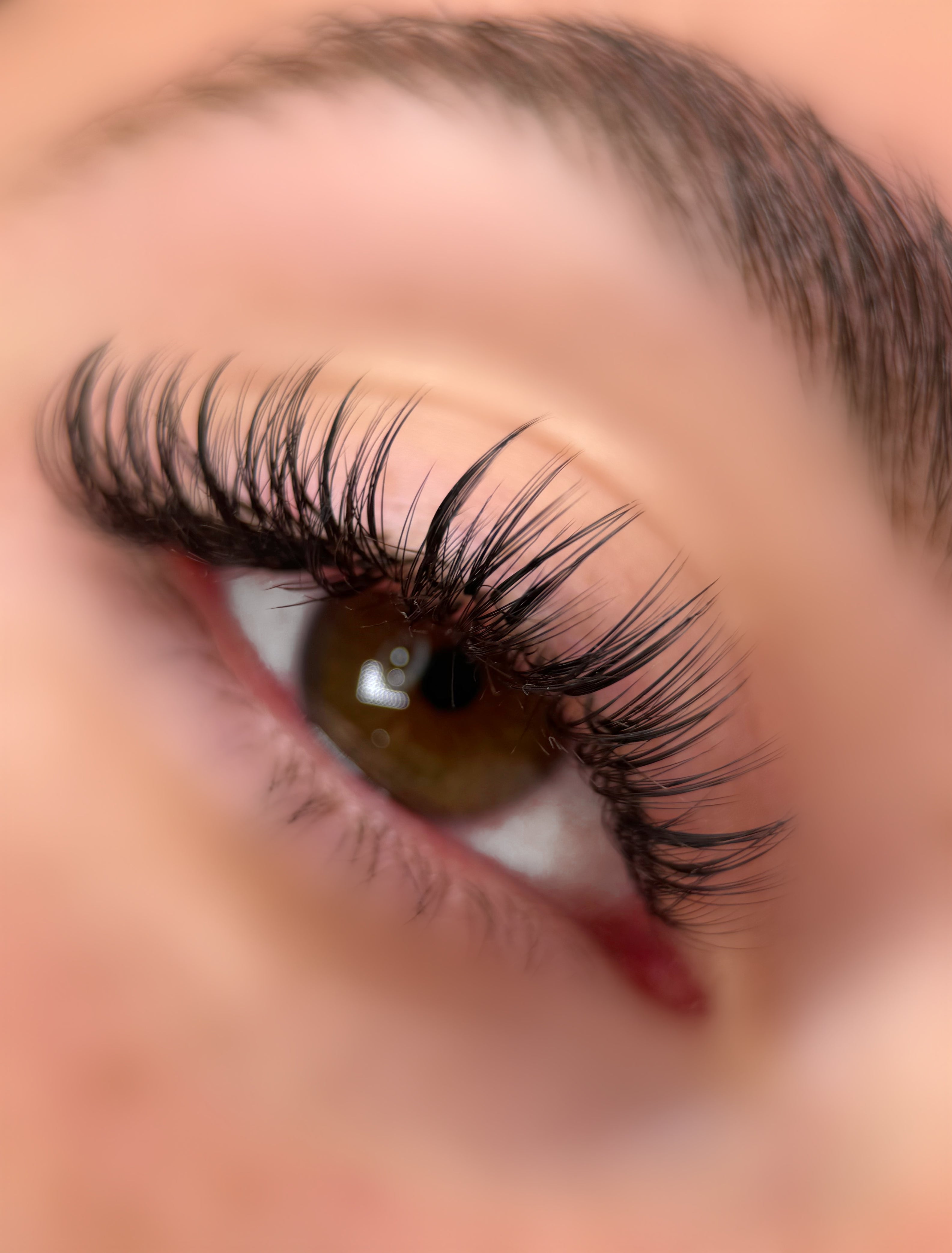 Hybrid lashes combine Classic extensions with handmade volume fans, creating a textured, wispy finish that sits between natural and glamorous. Our fans are crafted by hand for a customised, feathery effect unique to you.